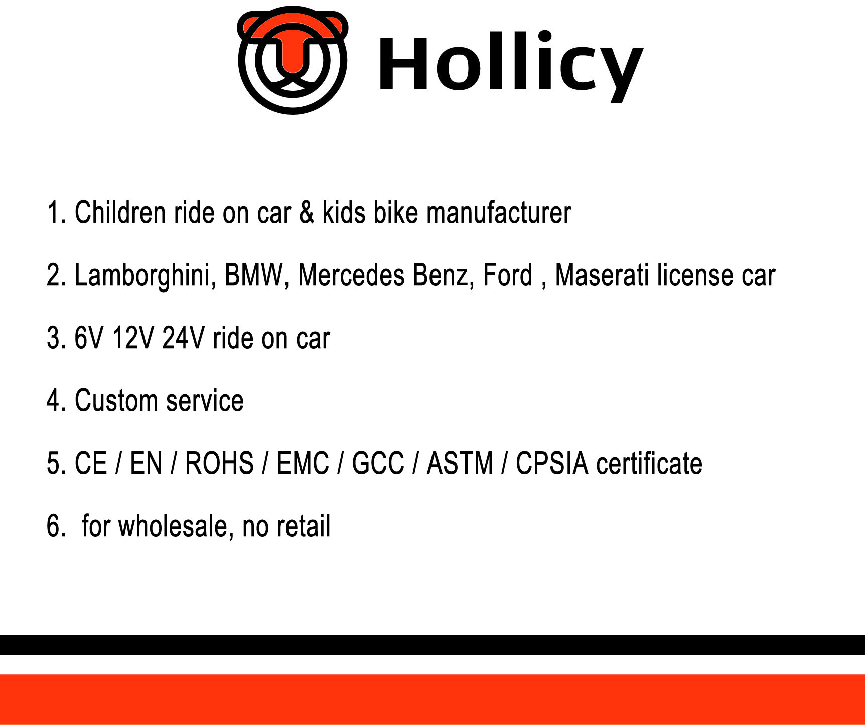 We are uncompromising in our standards of safety, making us benchmark for our industry. Therefore, all of our e-cars and kids bikes comply with strictest safety standards, and have passed EN71, ASTM, FCC, CCC, and EAC tests. We have full and complete test equipment and continuous quality control system.